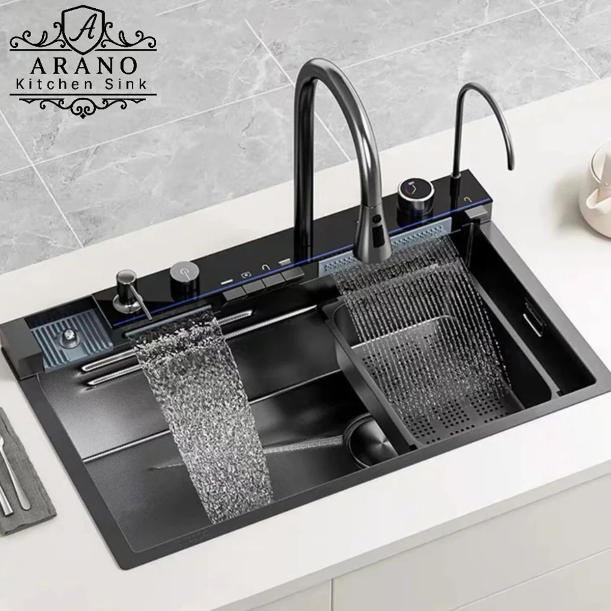 این سینک یک نمونه کامل از سینک پیانویی ولومی و سینک آبشاری و پیانویی است که امکانات حرفه‌ای و طراحی مدرن را در یک محصول جمع کرده است.